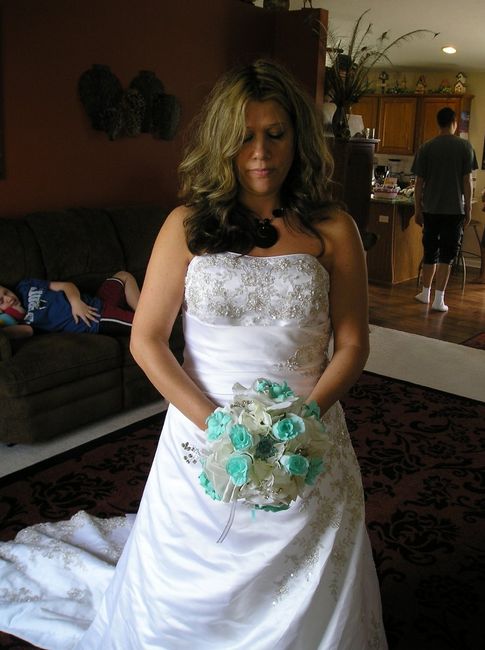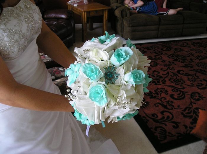 i got 2 bouquets done.mine and 1 bridesmaid..what a pain in the butt.I spray painted the little roses tiffany blue.what do you guys think?