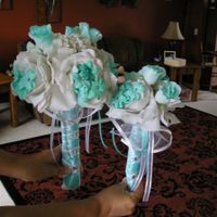 5000 days agoI got 2 bouquets done.mine and 1 bridesmaid..what a pain in the butt.I spray painted the little roses tiffany blue.what do you guys think?