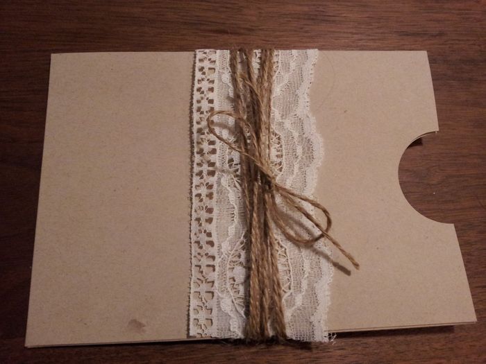 Good evening! Since you ladies have been so helpful with my STD, I thought I might ask your opinion on my DIY invitations too! I plan on using a pocket sleeve, and I want to add lace and twine. But, I can;t decide which lace to use!! If I used the...