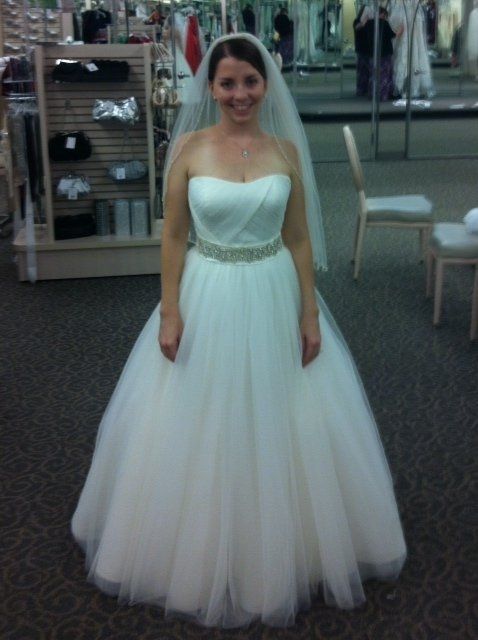 Hi ladies--I had my first fitting--without my mom (she is in another state)! I need some opinions of what jewelry to wear. I am doing hair up with a veil! The dress will be a bit flatter when pressed!