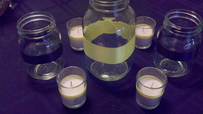 So I worked on them all day and tomorrow I will be finishing them, or at least all the parts of it. I am going to dye sand black and put that the botton of the three mason jars and then add more votives inside them but with out any ribbon. I just...