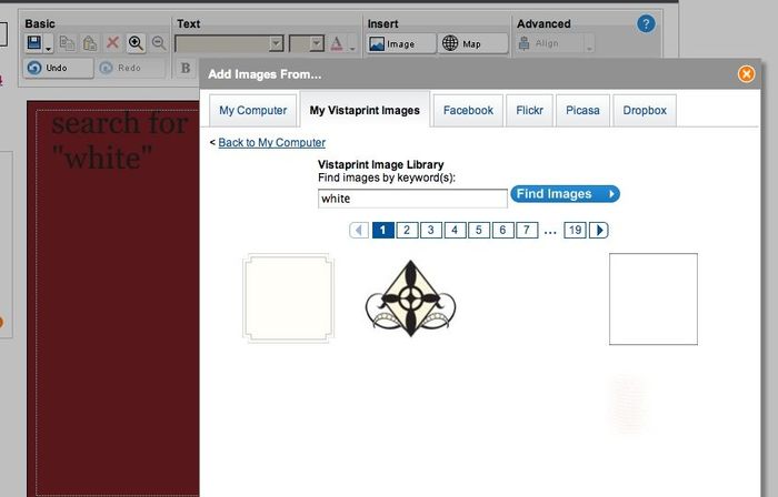 I noticed when going through Vistaprints "white" images, there were a lot of blank ones that you couldn't see in the preview window. So I put a red background on and loaded all the images and took screenshots. Hope this helps someone.
