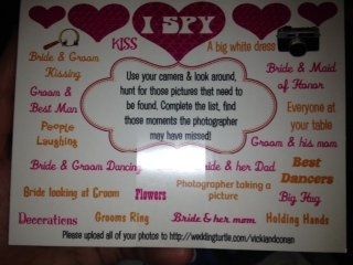 I am defiinately love the idea of having a different list of things for people to find and take pictures of on each table, like couple kissing, ring bearer dancing, things like that, I have googled and found alot of different things, just wondering...