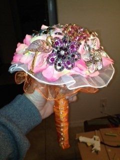 Hello ladies...haven't posted in awhile, but I am nearly at my 3 month mark, so I am going DIY crazy! I just wanted to share some photos of my brooch bouquet that I finally finished last night and also the sea shell pomadors that I am currently...