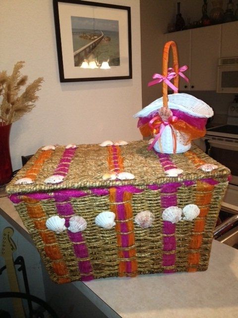 Hello Hello! We are doing a sunset beach wedding so I went with what I consider sunset colors, orange and pink. I picked up the small basket for 25 cents and the larger basket for a $1 at Goodwill. The small basket is of course the flower girl basket...