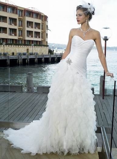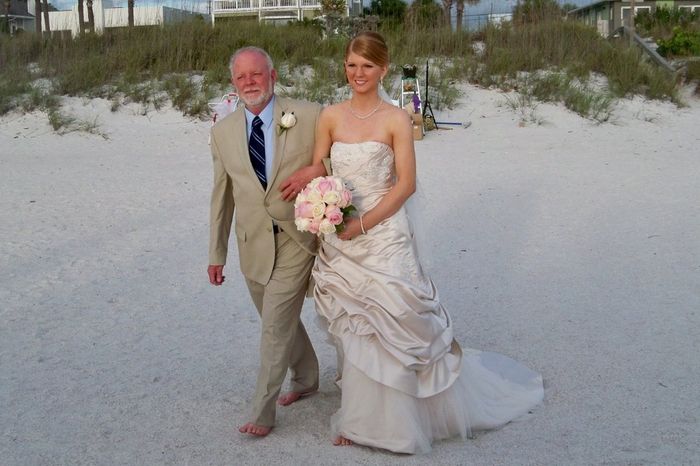 My FH and I discussed having a beach wedding in Florida, so we wanted more of a casual tone to our wedding. Originally I was thinking maybe a chiffon flowy dress, but I made the mistake of trying on this huge toile filled dress with a train just "for...