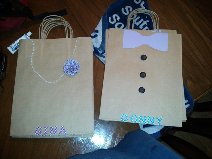 Okay so I am NOT crafty at all I mean I made a C in art class in college, but I was very proud of myself when i finished these bags not to shabby. I think they will add a little decoration to the rehersal dinner too.