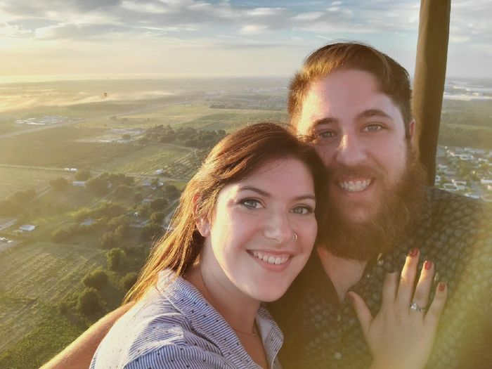 I met my fiance about 5 years ago at a Halloween party. He was a lumberjack and I was a chef, I didn't think much about it as we played beer pong together (undefeated) and I made shots for everyone. We didn't keep in touch after that party because we both had significant others at the time, and we were just friendly with each other. About 2 years after that, I was single scrolling through OkCupid and I found a very handsome bearded man. He agreed to go on a date with me. (We didn't realize we knew each other yet). On our first date, he brought everything I said I liked on my profile; sushi, horror movies, wine, romantic movies, and whiskey. (I know realize that I'm not a huge fan of whiskey anymore). Since I met him on a dating app, I had no idea if he wanted a serious relationship or not. So on April 1st, I asked him to be my boyfriend. This way if he said "no" I could play it off as an april fools day joke. We got engaged on June 30th, 2019. He woke me up at 4 am (which I was not too happy about) and told me we were going somewhere far and we had a long way to drive. Well, instead we went on a sunrise hot air balloon ride. As the sun rose on the horizon, he got down on one knee (which was difficult in that tiny basket) and asked me to be his wife.