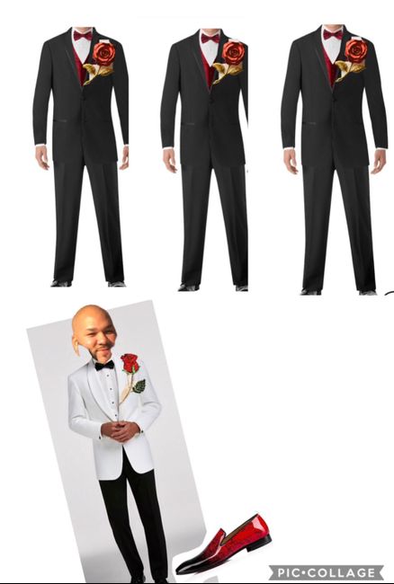 What will your groom and the guys be wearing?? This is our inspiration...adding some gold yo the groomsmen but my groom and our son will definitely be wearing the white with black touches on the jacket and black pants.