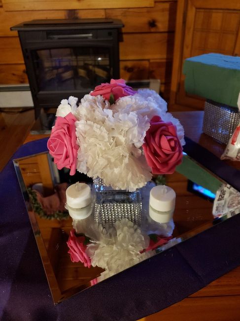 The first attempt at making our centerpieces, I just had to show them off ! What would you change if anything ? Indoor July reception, white tablecloths with the purple overlay (used a napkin for the trial)