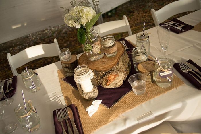 We are having ivory table cloths with sage green plates and ivory napkins with chocolate brown saches for favors and chocolate brown drink napkins. In 2 mason jars on every table we will fill them with white daisies and 2 mason jars with floating...