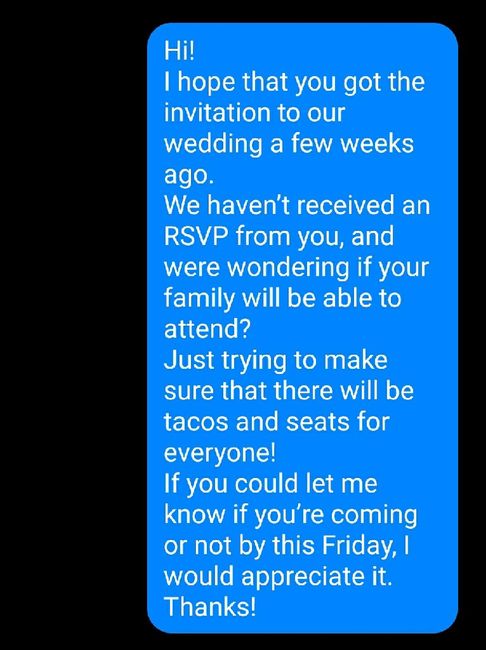 Our rsvp deadline is Saturday. Im so ready to start harassing (just kidding) ppl to ask them if they are coming or not. Im really anxious about our guest count because our count went up by A Lot. So far we have 120+ ppl with no response. We shall see...