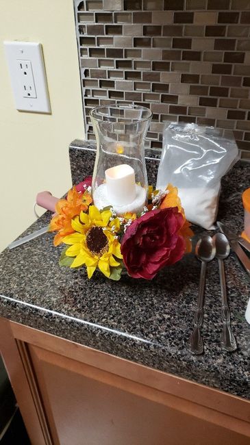 Hi everyone. I'm getting married in October and was planning to diy my centerpieces to save a little money. I'd love some opinions on the piece i just put together. My colors are burgundy and fall colors, yellows, oranges, golds. My bridal party...