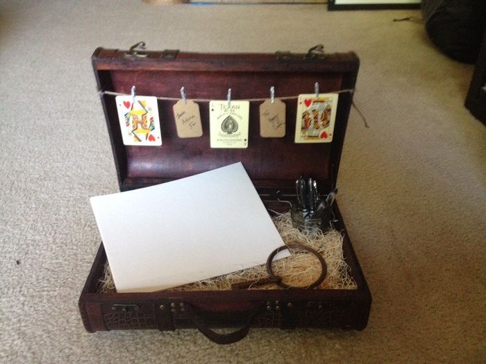 My two completed DIY's for the weekend! My decor suitcase for storing guest "fill out" pages and the tags for my peach pie moonshine favors! Show me your completed DIY's from this week!!