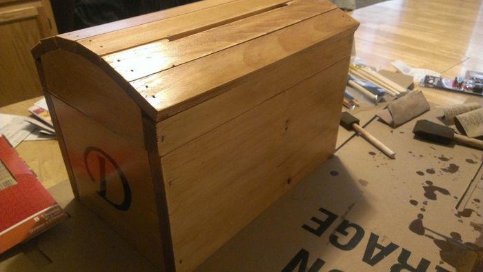 So I had posted before asking about what to put the cards in. I had bought a cute white wicker basket and then was told NO!!! people will steal from you so I made this instead. I still have to add the latch and it will have a lock. This way it is...