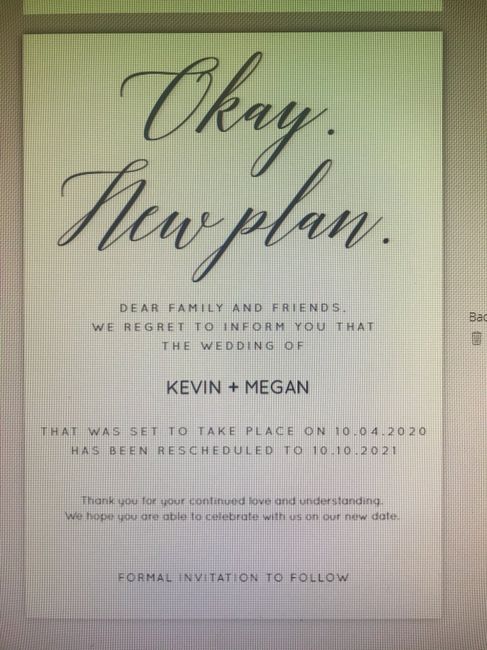 My wedding date is October 10, 2020. We ordered and received our invites about 4 mos before the date (in late June/early July), but we literally on the 90 day mark decided to postpone. So we did not and will not send out invites. So the only thing...