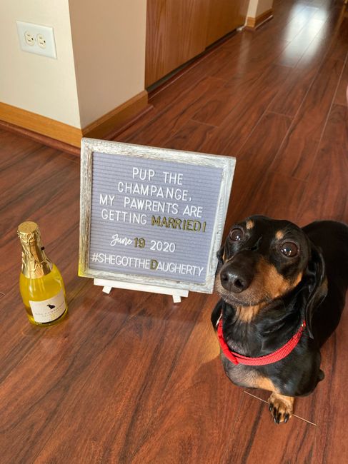 Is anybody doing “fun” save the dates? I found a bottle of doggy champagne (bacon flavored 🥓), so I couldn’t resist incorporating our hairy toddler!
