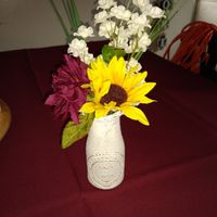 2412 days agoSo round tables. Table cloths are white . Burlap runners, rounds of wood with lanterns and candles possibly inside a couple little flowers or fall leaves or moss. A milk bottle little ones I painted with chalk then aged by scrubbing the crap outta...