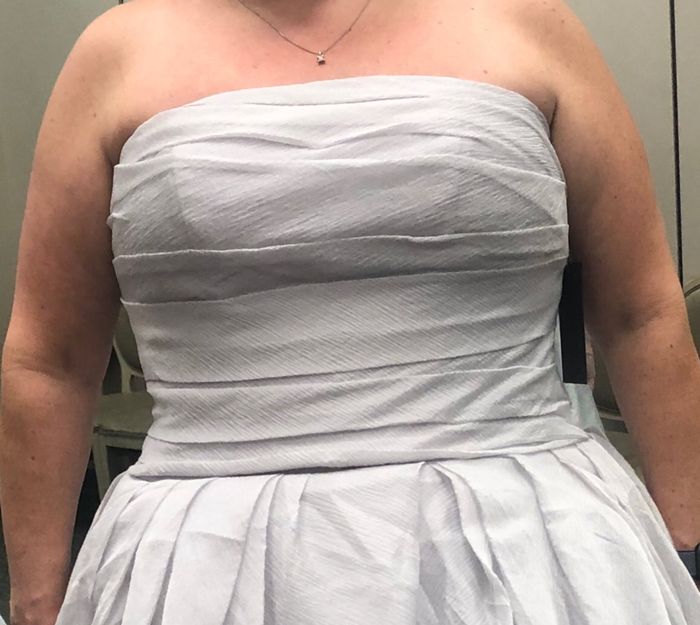 When I originally tried on the dress, they had me wear a bra with the boning down the sides to my waist. This is my dress after it came in and I’m wearing no bra. Dress is fresh out of the bag though so kind of wrinkly because it hasn’t been steamed....