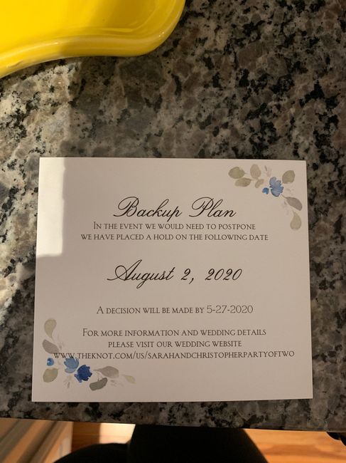 Hi all! So we are in the position of postponing due to COVID-19. Our wedding date is June 27th, and we originally had a back up date of August 30th. I am thinking all summer weddings are at risk so we are changing our back up date to June 27th 2021....