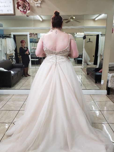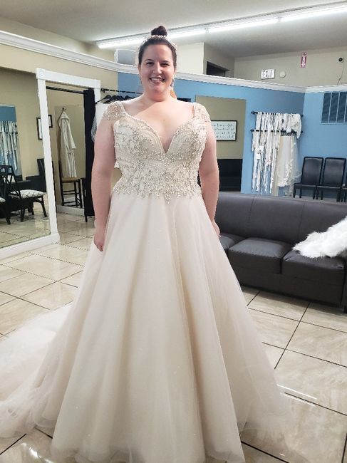 Drop your wedding dress photos below. I am having a hard time not showing my future husband. P.S. I hate my picture taken and am super self conscious. This is the off the each try on. 3 sizes too big.