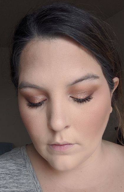 So I am doing my own makeup for the wedding and have been trying a few different (but similar looks). I can't decide if I love more of the gold or rose gold tones on the eyes or if I like darker or more Pinker lips. Let me know your thoughts! First 2...
