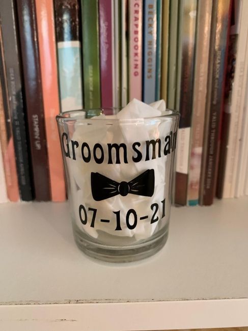 Excited to be asking my bridal party soon. Just need to put them together and see them. each person cost me $6 I have 8 on each side so not terrible and the fact I made them cost me way less. Girls are getting a bag with hair ties and a card asking....