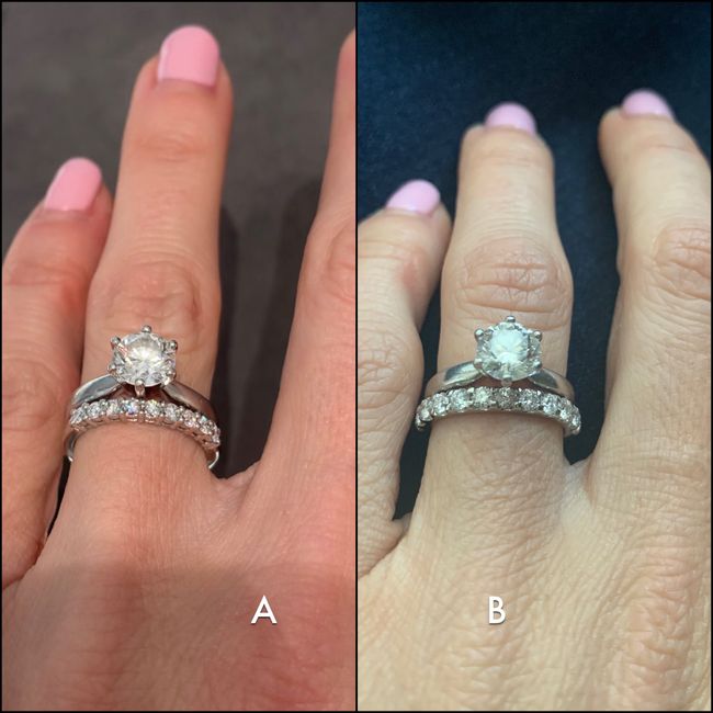 Ladies! Which band do y’all think looks better? I know they are similar and I love both. One is also significantly more money but let’s assume money is not the issue. More diamonds and carats on B.