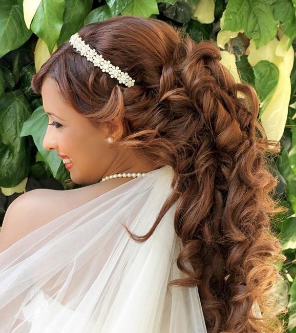 I need some ideas please. FH wants my hair down. I have naturally curly shoulder length hair. I will be wearing a veil and I have a ribbon headband that I can wear if the style fits it. Go.......