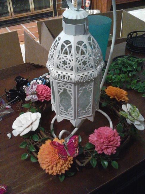 Today we decided to start on our centerpieces. We used butterflies, sola flowers, grapevine wreaths and greenery to make them. The mini stand and lanterns will sit inside of the wreath and candles will go inside of the lanterns. What do you think?...