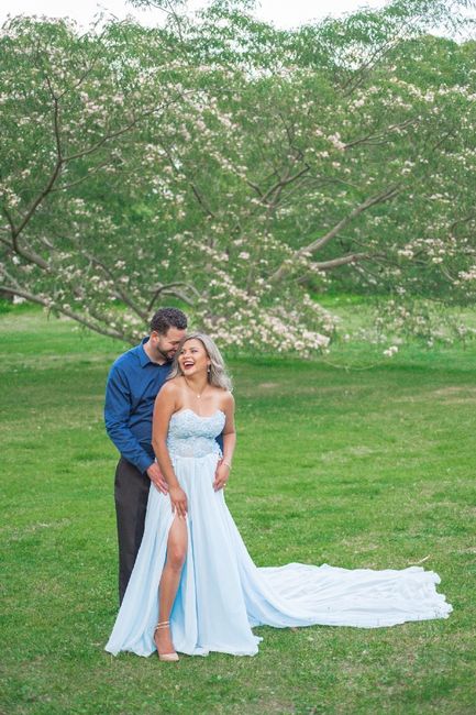 Our engagement photos are here and I'm so in love! After postponing it 3 times due to COVID-19, it was near 100° that day and our dog Enzo only lasted 15 mins before he had to be taken home, but it was all worth it! I also designed my gown as I am...