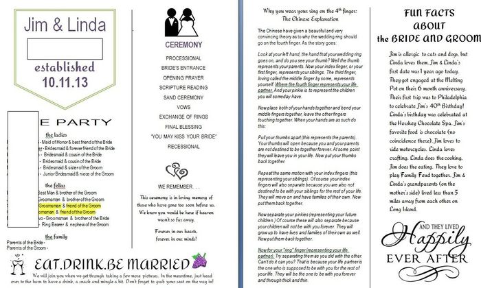 So I am now at the point where I am designing my wedding programs. Decided against anything really fancy. What are you doing? Do you have a favorite template? Show us a picture! I think I will be doing the wolfpack template I found online. But maybe...