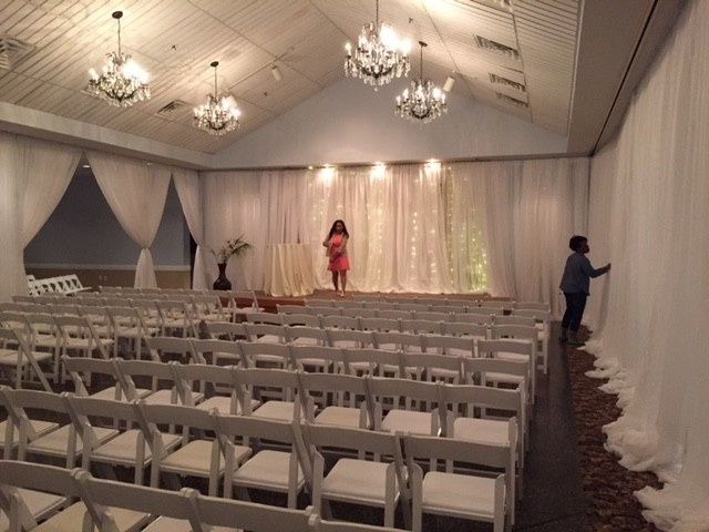 My venue has a stage that we will use for ceremony. Can anyone suggest ways to decorate the stage? See pics below Thinking of a chuppah but we will have to use space for dj & band afterwards. Any Suggestions?