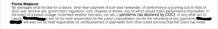 Is it ok for a venue to change the force majuere clause in the contract to exclude pandemics in the middle of a pandemic?? We decided to postpone our date from June 4th to August 23rd, and our venue coordinator just sent the updated contract for us...
