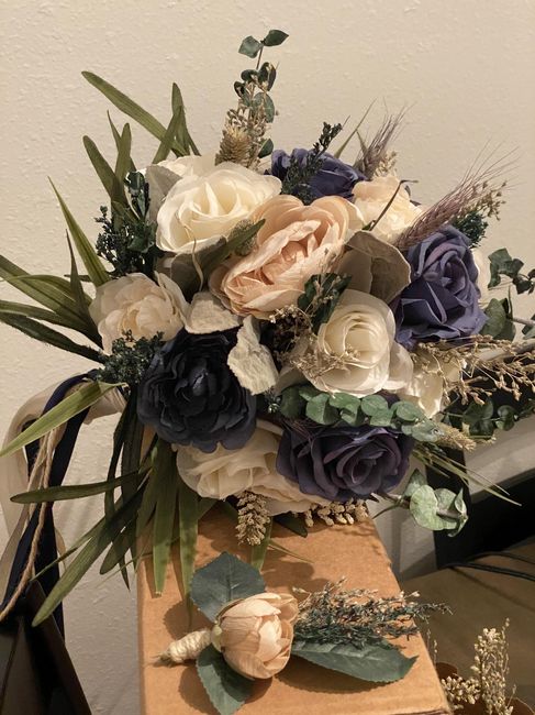 We are eloping at an AirBnB on the beach next month and our colors are navy and cream. This is my first time working with dried flowers but I really like how they worked together with the silk flowers! I think I'm going to redo the boutonnière and...