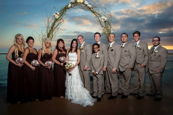 I'm trying to figure out what color to do for the tuxes, my bridesmaid dresses I want to do dark brown ??