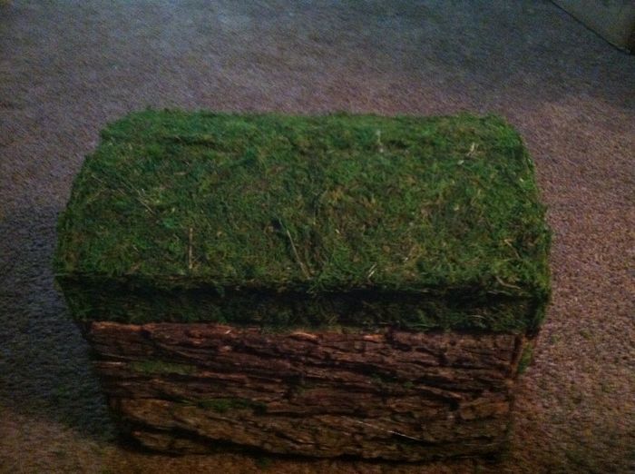 What do you guys think? I'm having a rustic/nature inspired wedding so I took tree bark and put it along the bottom sides of the box and used moss for top. You can't really see it in the picture, but I cut a long slot on the top to drop the cards in....