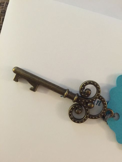 So I ordered and received our wedding favors last week. They are adorable little "vintage" looking keys that are actually bottle openers. I am going to use them for double duty and have them serve as the escort card as well. Probably attach a little...