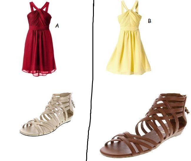 we have picked out these two dresses from DB in APPLE RED.... our theme is fall what color shoes do you think will look good?