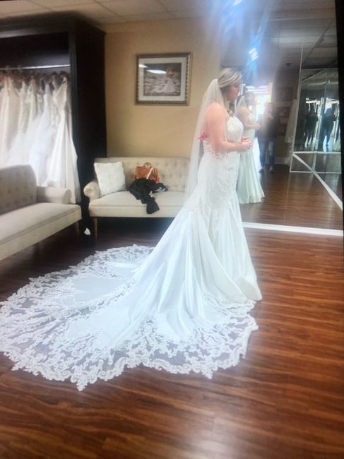 Finally found the dress of my dreams!! I’m in love with the train and all of the detailed lace/bodice crystals. Still hoping to lose some weight so I can feel more comfortable on the big day!