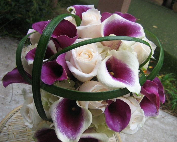 Our colors are purple and silver. I have been thinking purple hydrangeas and picasso callas for me and white hydrangeas and picasso for the girls. But then I am thinking I also like purple and white stock, orchids, and regular lilies! What are your...