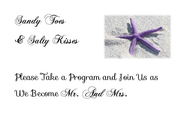 I can't quite figure out what I want to put on a sign at the end of our aisle telling guests to take a program and have a seat. Roughly: "Sandy toes and salty kisses. Please take a program, have a seat, and watch as we become Mr and Mrs!" OR "Sandy...