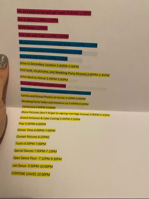 I have made a timeline for the day of and just need other people to take a look and let me know their thoughts. The whole venue will be set up the day before if that matters. The ceremony and reception are in the same place. If you can take a look...