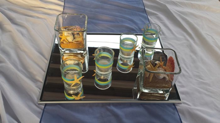 This is what we're thinking to use as our center pieces for our causal beach wedding. What do you guys think? And ignore the sheet under the runner, we didn't have the white table clothes here was just using it to get an idea of what it would look...