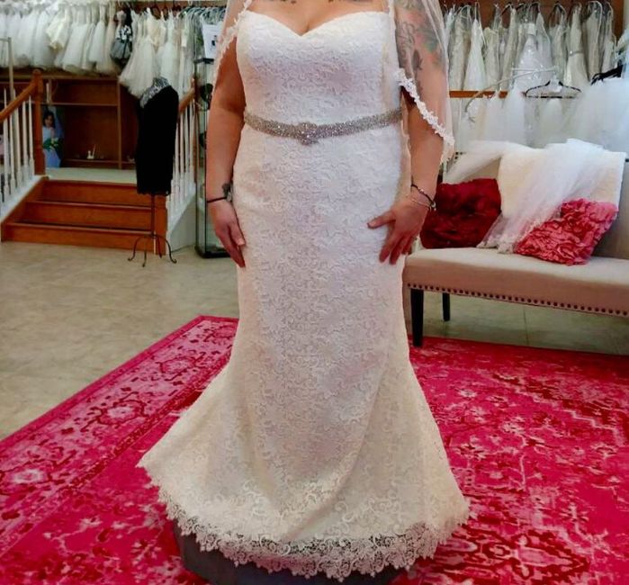 *The only pictures I have from my first fitting that show the bottom* I chose a dress with a very short train. Initially I was going to get the veil i tried with it but i decided to wait. At my fitting the other day, the seamstress had me try a...