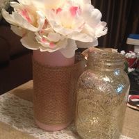 4290 days agoSo here is one of my centerpieces. It's still a working progress but I wanted to post some pictures to get some opinions! The burlap underneath is going to be the table runner. We will also be using ivory or pale pink tablecloths underneath the...