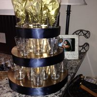 4436 days agoOrginally I had planned to create a shot glass cake using a tiered cup cake stand (cardboard). I wanted to add ribbon and make it look really cute. In addition, I planned to add gold tissue (our wedding color) in the glass to make it look better....