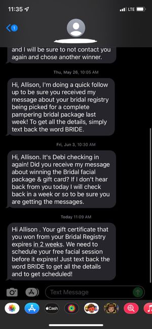 For the past month, I have been getting text messages from a random number saying that my registry was entered into some kind of drawing and that I won a package. I went to a bridal expo in February, so it’s possible it’s from that. But they never...