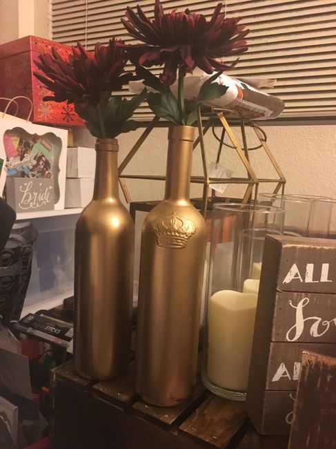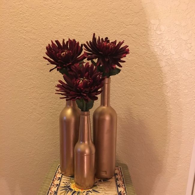 I'm making my centerpieces and looking for some feedback... I know these photos are not the best, but you get the idea. My future in laws spray painted the bottles for me, I bought and arranged the faux flowers (I'm allergic to real and hate the...