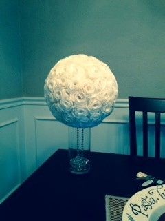 Our theme is white pumpkins, table overlay will be plum. I'm trying to keep the centerpieces simple so they are easy to transport, trying to save money, and don't want too many things to collect after the party. I've been searching Pinterest for...